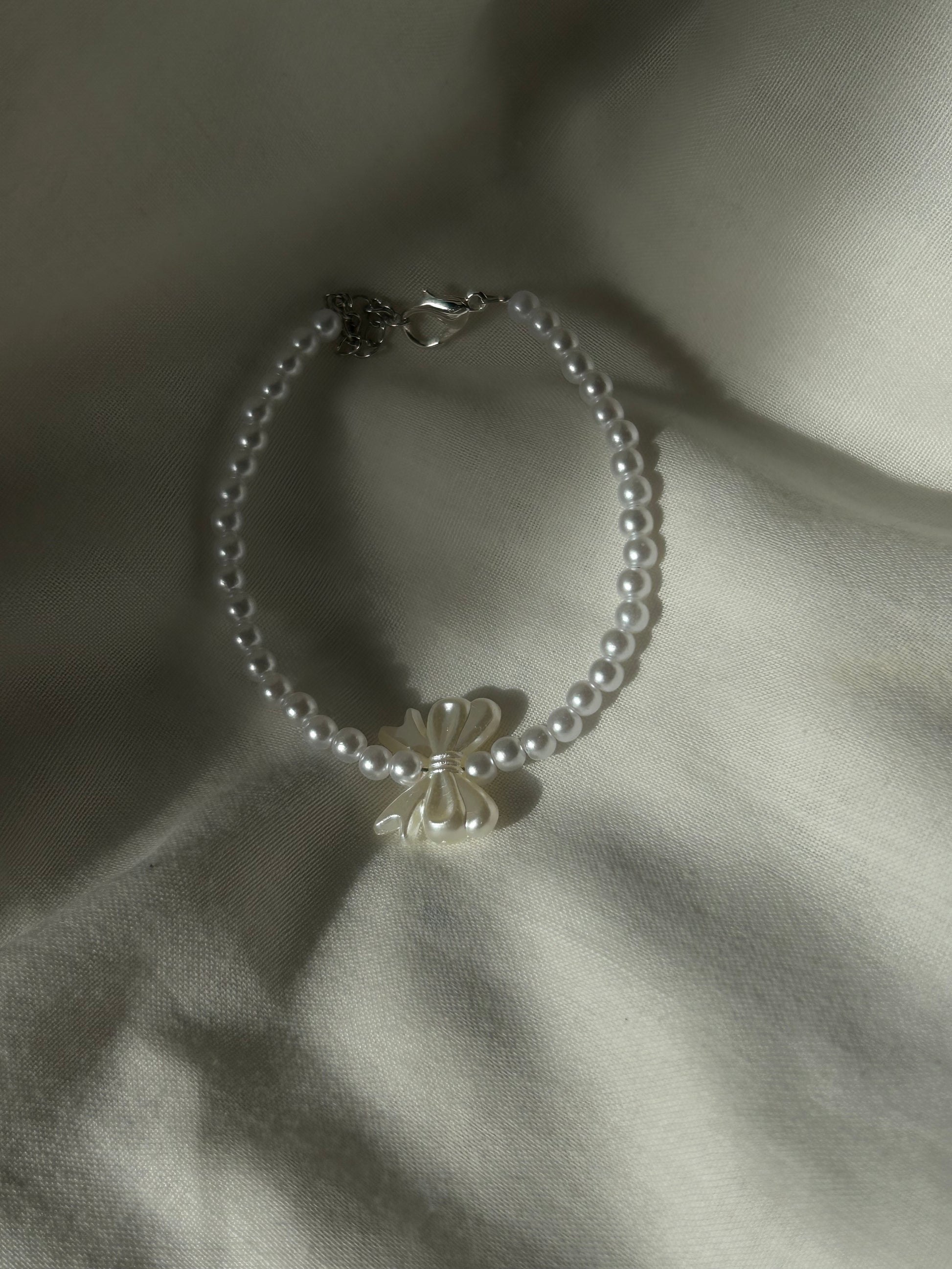 pearl bracelet with a white bow charm