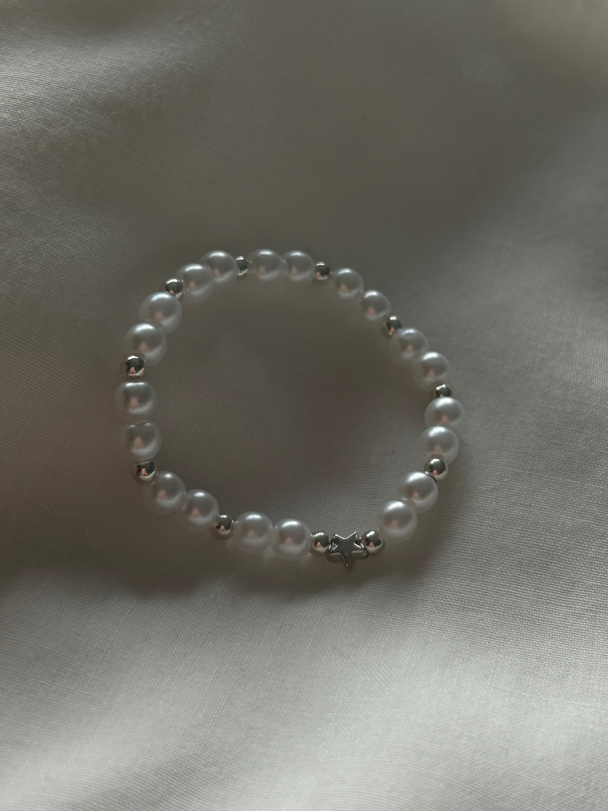 pearl and silver beaded bracelet with silver star charm 🪩🤍