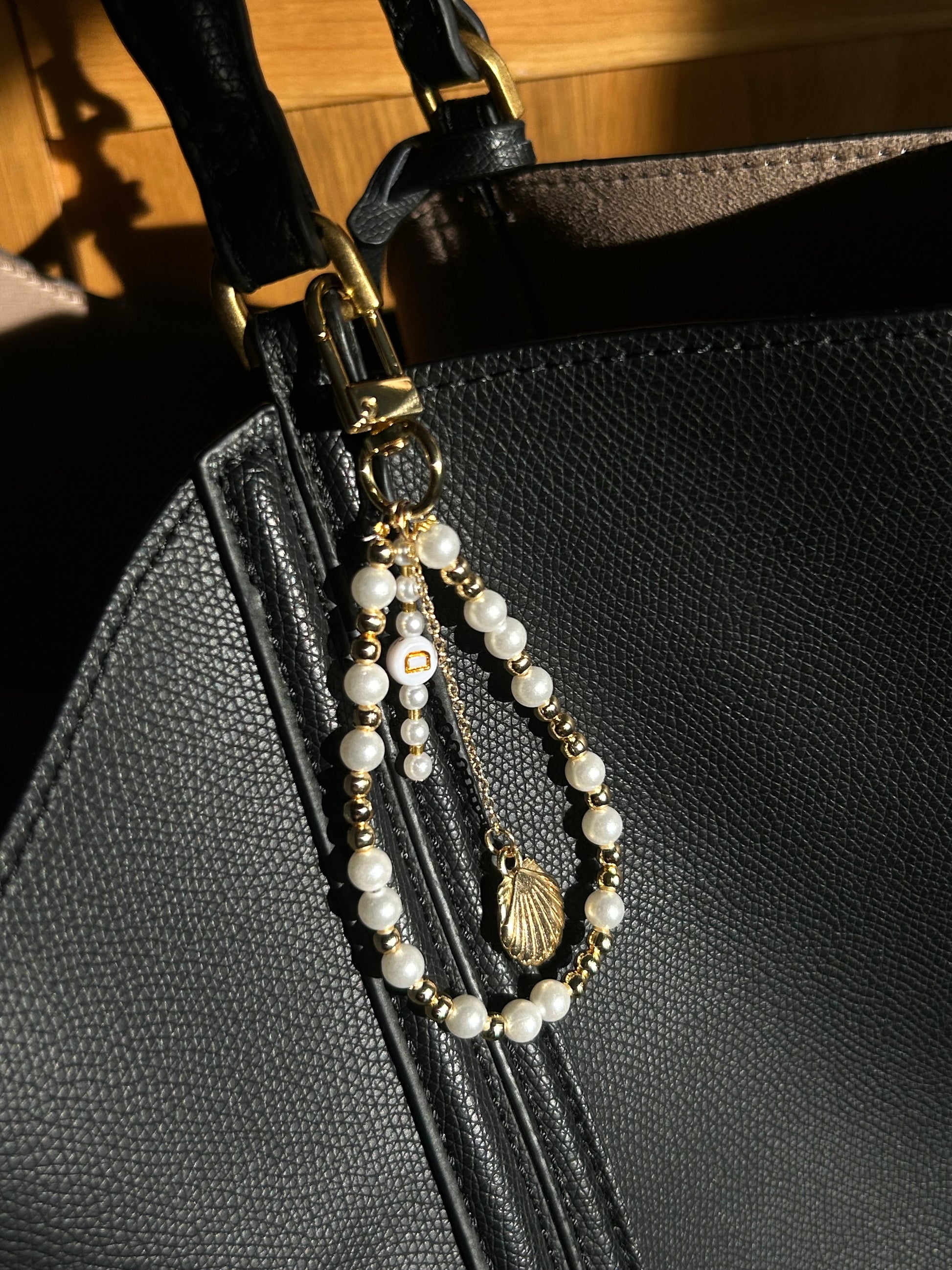 made from gold plated beads, pearl beads (plastic), gold plated chain and gold plated sea shell charm.